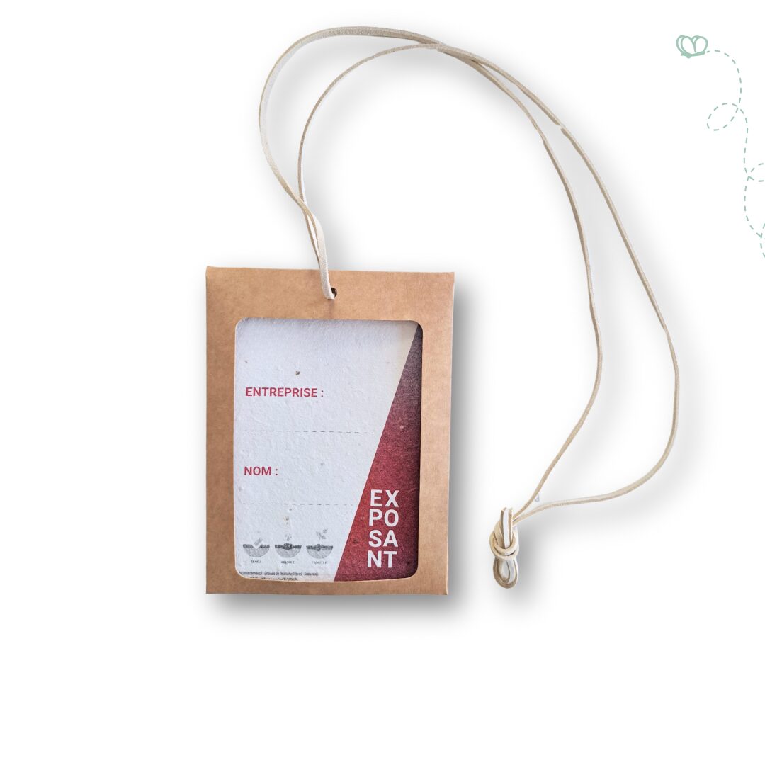 Notre porte badge et badge à planter présente plusieurs avantages. Tout d’abord il est plus responsable que les badges plastiques utilisés lors des événements éphémères. Ces badges plastique sont souvent aussitôt jetés… Ensuite, il est élégant. En effet, son joli écrin en papier kraft épais, et son tour de cou en cuir recyclé sont très esthétiques.