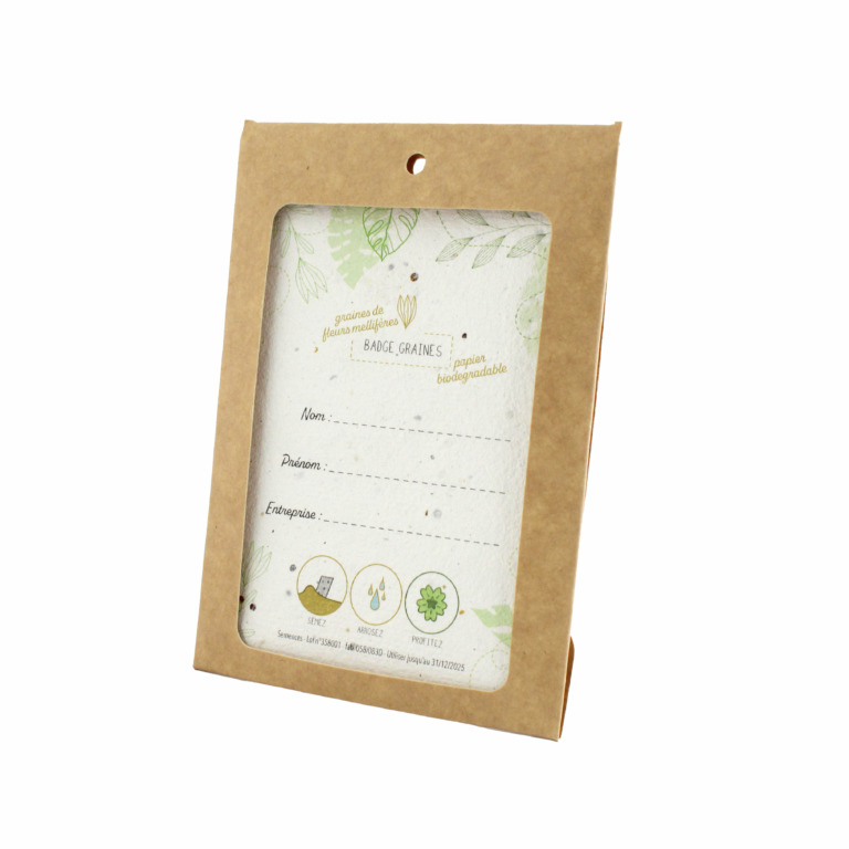 - à l’intérieur, un badge en papier ensemencé imprimé en quadri recto (noms variables possibles)