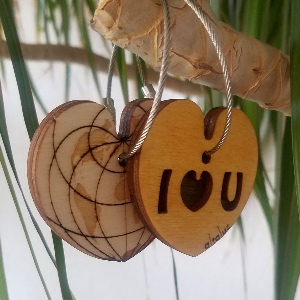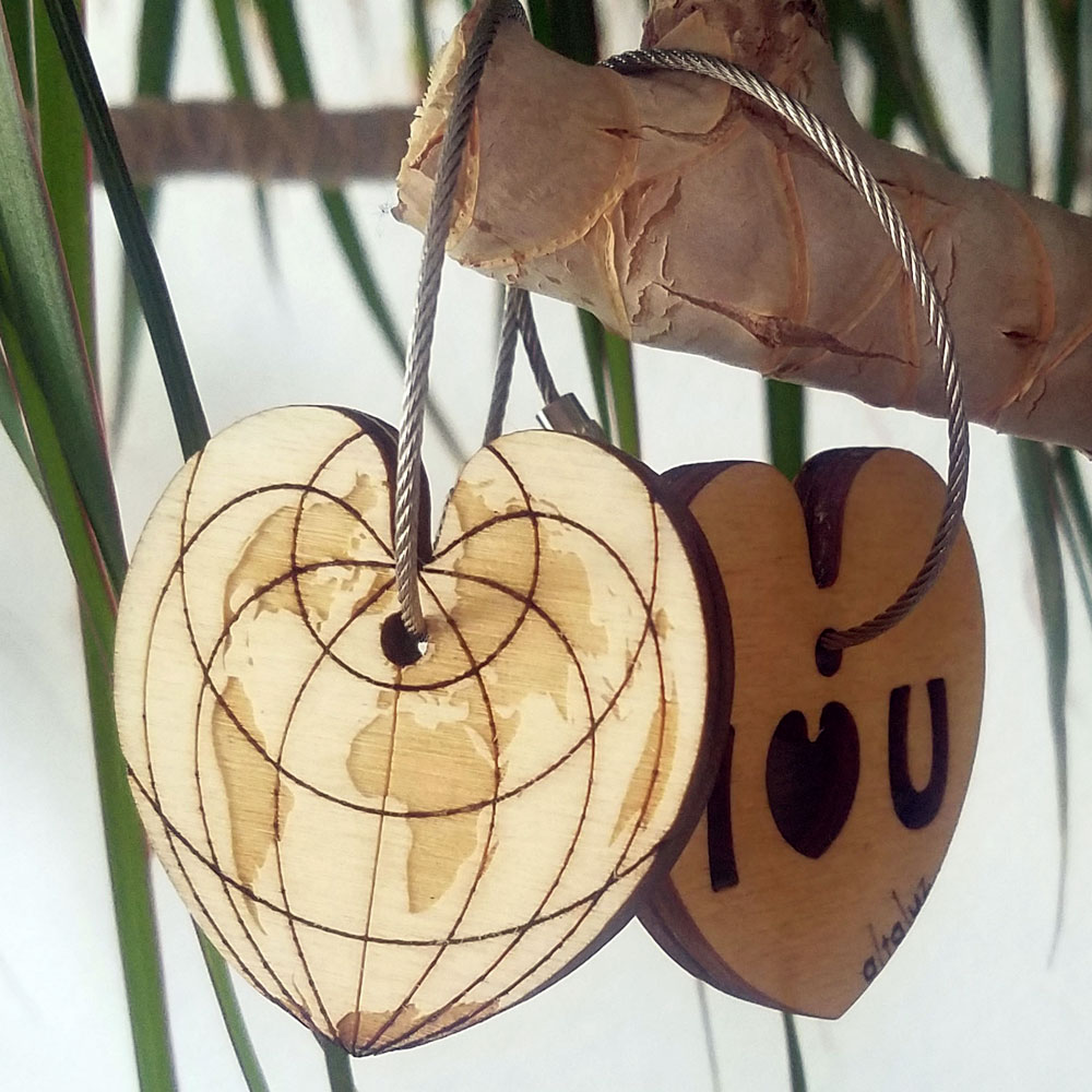 Nul besoin d’attendre une occasion pour offrir un petit cadeau à votre moitié… Ce porte-clé est une jolie preuve d’amour : offrez-lui le monde en plus de votre coeur ! D’un coté, une carte du monde est finement gravée et découpée. De l’autre, le bois est ajouré avec la mention « I LOVE U ». Accrochez-le avec un câble inox, à la fois design et efficace !