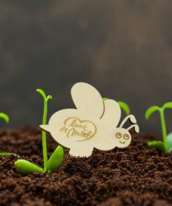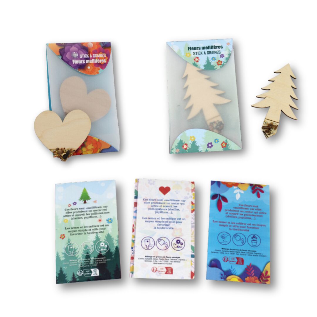 Le stick bois graines intégrées contient des graines bio au choix, et se plante directement en terre pour faire pousser facilement les graines. Cartonnette personnalisée dans son sachet et gravure laser do logo.
